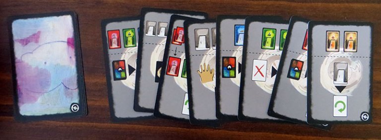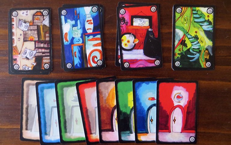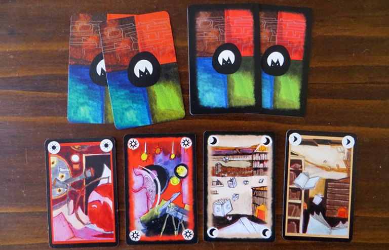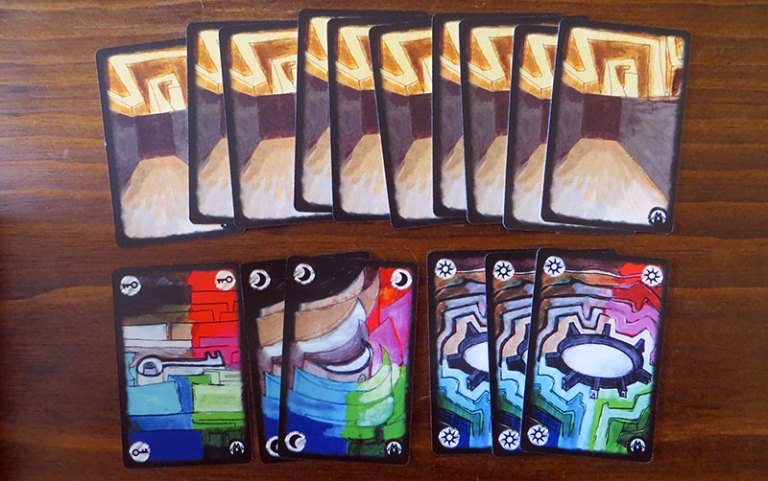 Este Onirim abrió el camino gracias a la pura simpleza en su mecánica. El tema es tan sencillo -según se mire- como es la necesidad de huir de un laberinto de sueños, representado por una línea de cartas de ‘localización’ de cuatro colores diferentes y con tres símbolos posibles (sol, luna y llave). Para ganar tenemos que encontrar ocho puertas, dos de cada color, lo que se consigue cuando somos capaces de colocar consecutivamente tres naipes del mismo color sin colocar adyacentes dos símbolos iguales.