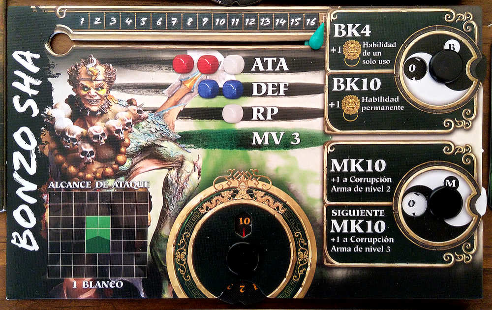 Hay más. Las fichas de personaje. Son tarjetones con información de los parámetros de cada monje. A saber, la salud, el buen y el mal karma, y los puntos de chi o energía vital que se usan para activar las cartas de habilidad. Además, hay una ilustración del personaje, un recordatorio de los dados que lanzan en cada situación (igual para todos) y un diagrama que indica el rango de ataque de cada uno. Casi todos los marcadores tiran de una ruleta. El de vida, no obstante, se marca con una cuña de plástico que resulta ridícula y poco efectiva.