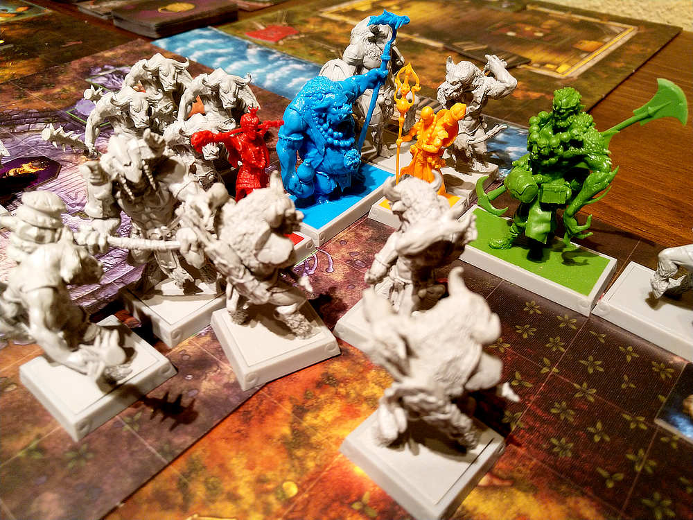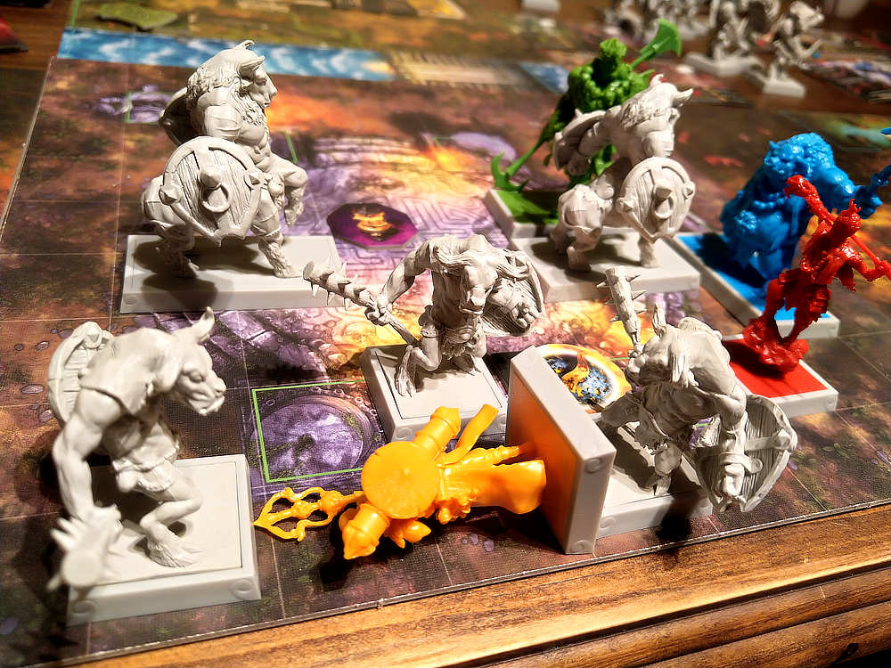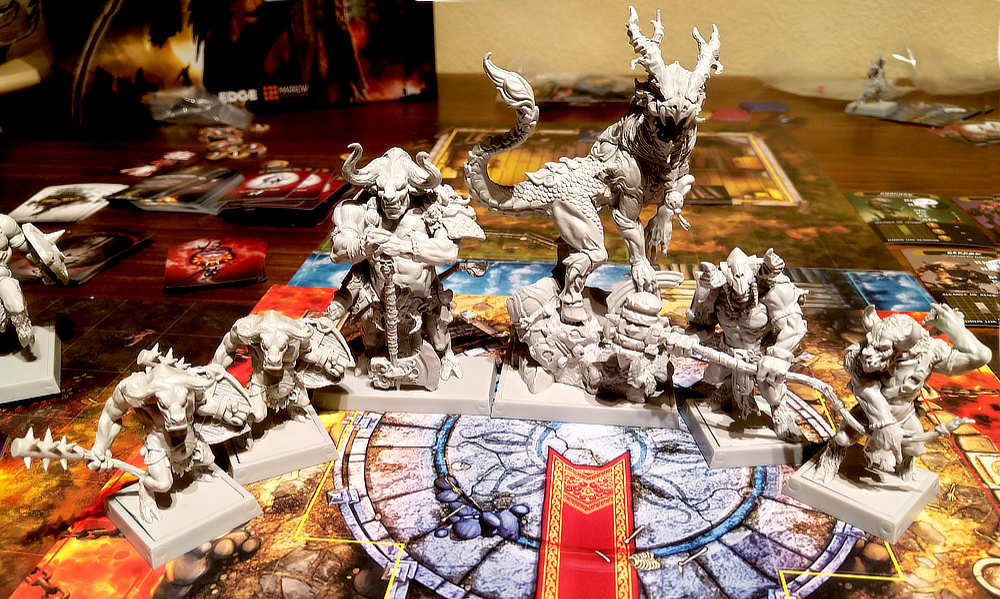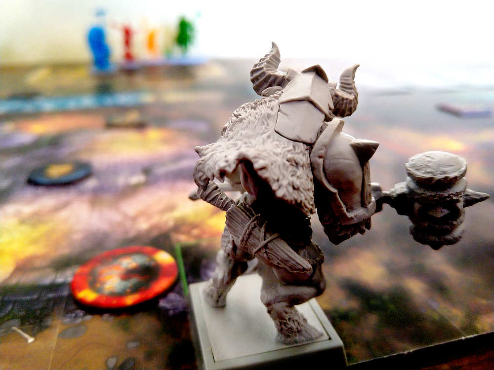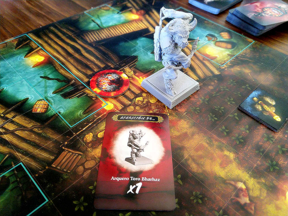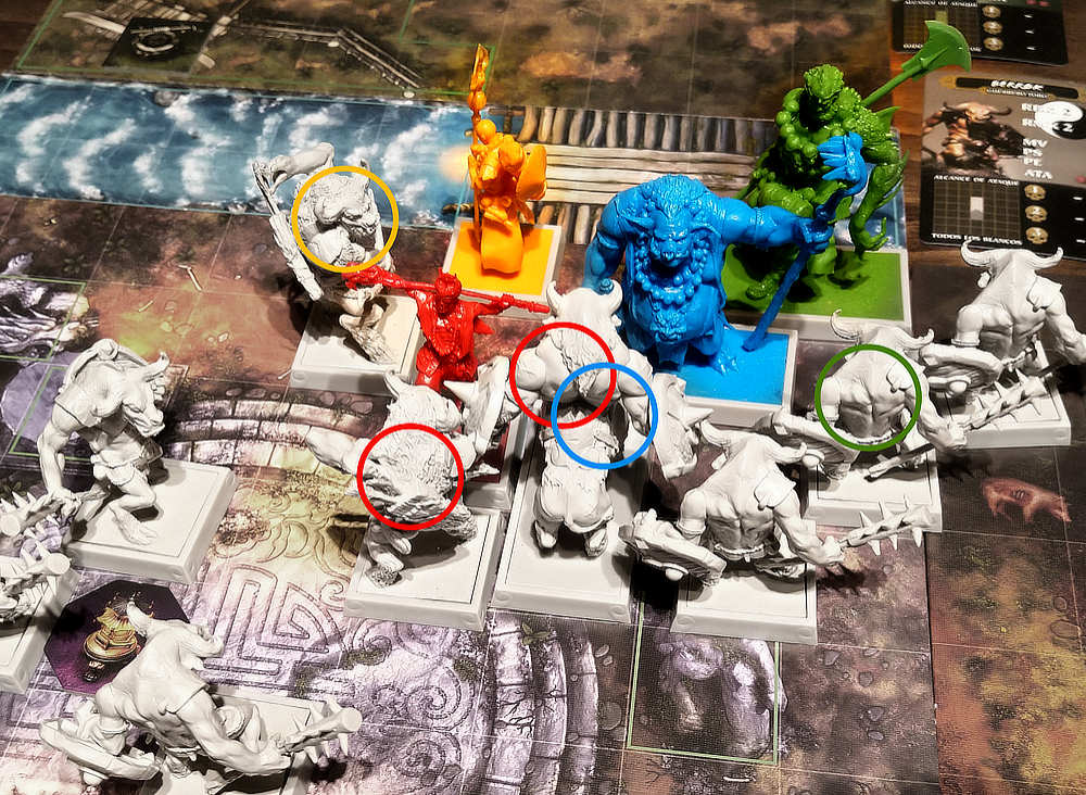 Respecto al material, otra pequeña crítica. Como decíamos, a primera vista todo tiene un acabado soberbio. Lo más llamativo son las miniaturas, que presentan un acabado magnífico, detallado y fiero, muy acorde con el espíritu del juego. Sin embargo, sobre el tablero estas figuras resultan desagradables de jugar. Hay algún tipo de personaje que, si se coloca adyacente a otro, sencillamente no cabe, no tiene espacio, y hay que improvisar soluciones para colocarlos sin estropear la experiencia. La cosa no pasaría de anécdota si fuera algo marginal pero durante una partida es algo que se repetirá constantemente.