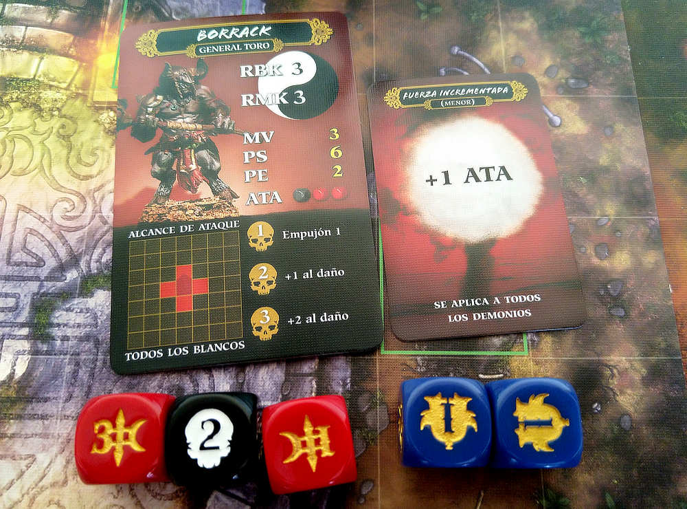 Sumando el valor obtenido en los dados y con los posibles modificadores obtenemos un número que hay que comparar con los puntos de salud del enemigo en cuestión. Y si es igual o mayor, le derrotamos sin más historia: excepto uno, todos los rivales deben ser eliminados de un plumazo de este modo; de lo contrario, se mantienen intactos sobre el tablero.