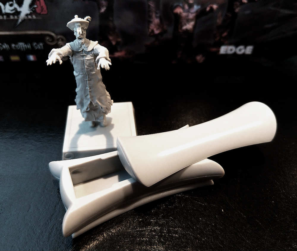 Además, sí que hay dos pequeñas ampliaciones. Una solo introduce escenografía, un conjunto de puentes de plástico que es muy prescindible y que, vista la web de la editora, puede hacer pensar que, de tener un mínimo éxito, podremos ver más en el futuro; mis reservas al respecto. La otra consiste en un nuevo tipo de enemigo, los Jiangshi, un vampiro muy característico de la cultura china que también nos puede sonar de representaciones populares. Su principal poder es la velocidad: tienen mucha capacidad de movimiento. En la caja vienen cuatro miniaturas más, y un ataúd que hace las veces de portal exclusivo en las aventuras específicas -dos- que se añaden con esta implementación. Aunque es posible también mezclarlos con el juego base para darle algo más de variedad y modular un tanto la dificultad.
