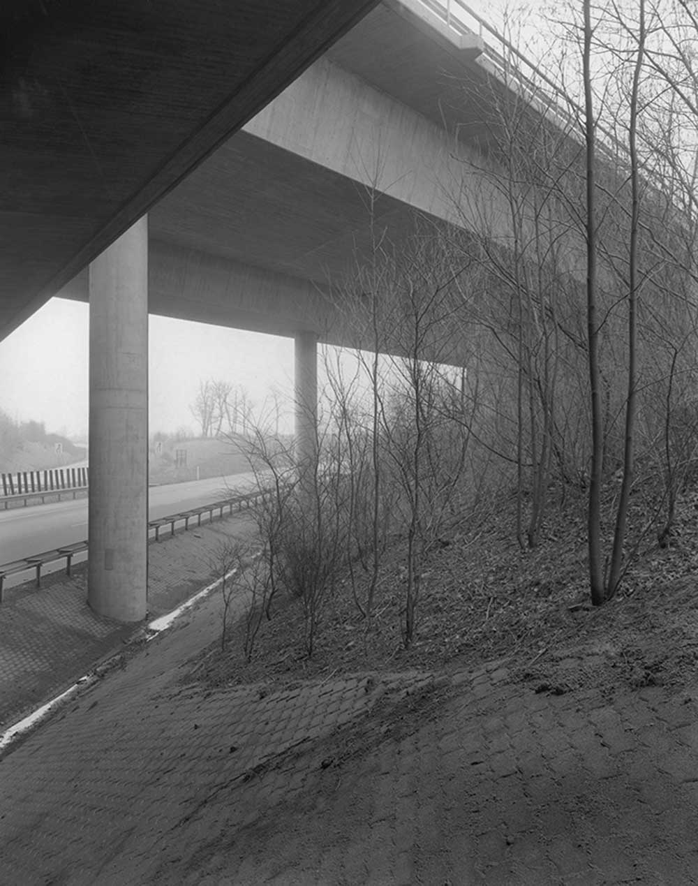 Líneas temporales en un suburbio de ZürichEn Alemania, por ejemplo, el enemigo precisamente era el discurrir de los meses y de la Historia. En este caso la acción se sitúa en ciudades de la RDA, donde el obturador trataba de aprehender el geist de una geografía urbana que, tras la unificación, era más que previsible que sufriera una considerable transformación. De ahí que veamos escenas de construcciones de marcado carácter comunista como bloques anodinos o fábricas que fueron inmortalizadas durante el proceso de desmantelamiento o demolición.