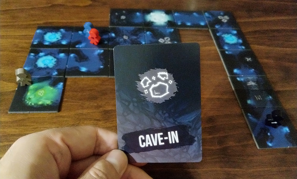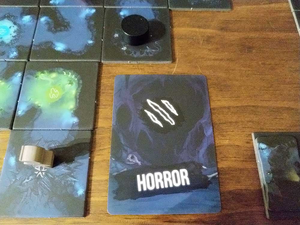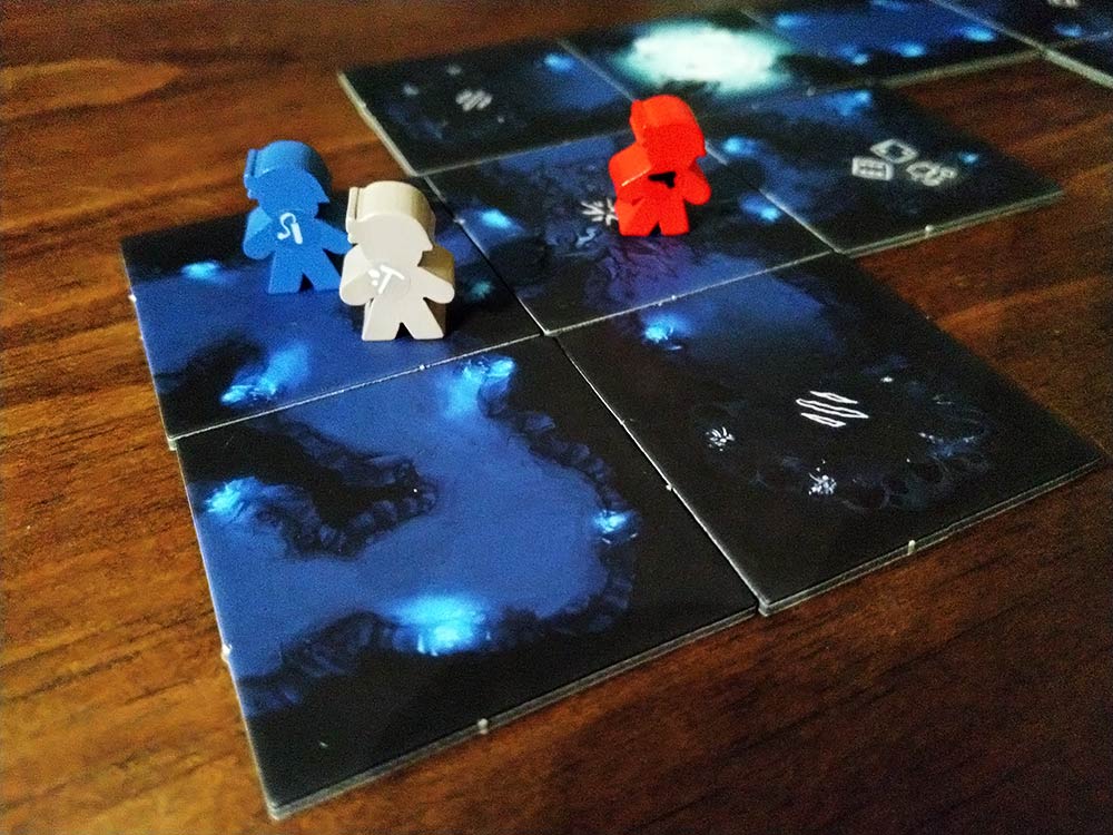 Pongamos que durante la partida hay que explorar una cueva a base de ir colocando losetas, como un Carcassonne o Saboteur oscuro en el que hay que enlazar caminos para avanzar en pos de la salida, que espera al final de un generoso montón de piezas (despejen bien la mesa, por cierto). Pero sucede que en esas losetas también nos encontraremos peligros; los típicos: inundaciones, bolsas de gas -necesitaríamos un canario para detectar estas cosas-, derrumbes, estrechamientos imposibles o incluso los denominados ‘horrores’, que imaginamos como monstruos acechantes que se relamen pensando en nosotros como cena al apagar las luces.