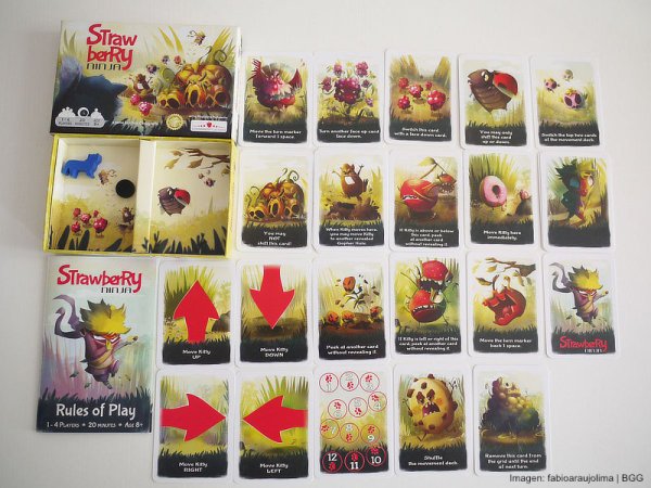 Strawberry Ninja. Ya en el nombre se percibe cierta absurdez, que acaba confirmándose no solo tras una lectura de reglas, sino después de las segunda y tercera partidas, cuando el pasmo de la primera queda sustituido inmediatamente por la confirmación de la engañifa que se nos planta ante los ojos. En el imaginario de Cesta de Patos, este su blog multidisciplinar, reinaba Tuchulcha en el olimpo de los peores juegos que han pasado por mi mesa. Hoy, se añade a tan dudosa jerarquía este indescriptible ninja de la fresa.
