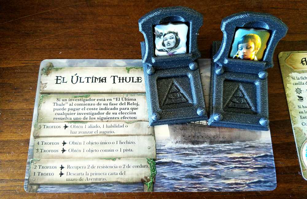 Otro volteo posible en el juego es el de la carta de entrada que, para esta ocasión, pasa a denominarse ‘Ultima Thule’. En la cara que empieza la partida ofrece la ocasión de gastar trofeos para conseguir objetos o curarse, como siempre. Por la cara del hundimiento la cosa se reduce sustancialmente y se convertirá más en un mecanismo de urgencia al que acudir cuando estemos desesperados que otra cosa.