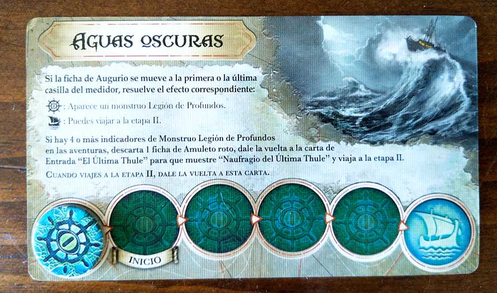 Creo que lo más importante para triunfar en Augurios de las Profundidades es entender la expansión. Me explico. Las tareas paralelas a la de conseguir símbolos arcanos no son tan intuitivas como en la aventura de Alaska o, por adelantar acontecimientos, la que se desarrolla en Egipto. Por ejemplo, las cartas de aventuras especiales no ofrecen una necesidad lineal como entonces. Aquí la utilidad es la de conseguir las piezas del amuleto y símbolos, pero poco más. En cualquier caso, lo dicho: una manera de jugar a El Símbolo Arcano de una manera muy diferente y más intensa que aquella para lo que fue concebido.