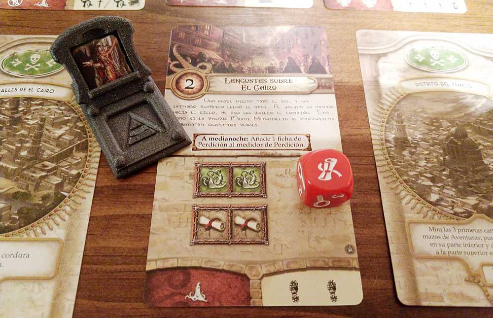 Hay dos maneras de ganar: o acumulando símbolos arcanos o ‘vaciando’ al primigenio de puntos de perdición en el combate final. La primera es a base de acumular el número de sellos que indique la carta del monstruo. Eso se logra o comprándolos o, más bien, como recompensa por completar alguna de las aventuras que haya desplegadas sobre la mesa y que hacen las veces de ‘tablero’. Simulan estancias del museo donde se desarrolla el juego y en las que ocurren ‘cosas’ que nos obligan a intervenir. En lo práctico, cada una tiene varias líneas de requerimientos -denominadas ‘tareas’- que hay que cumplir con las tiradas de dados. De completarlas todas, el investigador obtiene la recompensa estipulada  y se la lleva como trofeo (entiéndalos como el dinero del juego); de fallar, recibe la penalización que se indica. Y a correr.