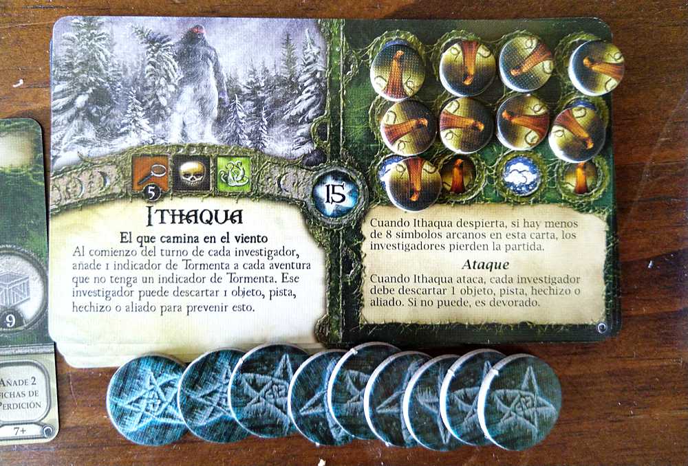 Para complicar el tema, de vez en cuando algún mecanismo puede poner en liza un monstruo. Este, surgido al azar, se convierte en una nueva tarea en cada lugar o nuevas condiciones que se añaden a las que ya existan. Según lo escribo pienso que es mucho más sencillo jugarlo de lo que parece. Y es que, por muy complicado que pueda sonar, al final el mantra es el mismo: tirar dados y conseguir los signos que te piden. Y más si el primigenio despierta y accedemos al combate final. Eso sí es un bajón, porque ahí ya es una carrera contrarreloj, sin piedad y sin freno, de lanzar, relanzar y volver a lanzar. Puedes acabar con callos en las manos por ello y más si, como suele suceder, a medida que avance el combate nos quedamos sin recursos para variar los resultados y las decisiones a tomar se reducen a la nada. Obviamente a estas alturas ni ambientación ni gaitas.
