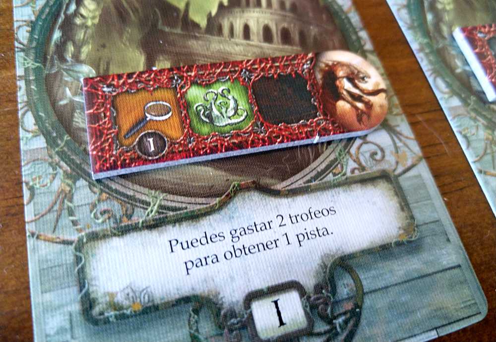 Esto se repetirá en el resto de expansiones temáticas que vendrían después. Pero lo más novedoso aquí -exclusivo y que de hecho da nombre a la caja- es la dinámica de los portales. Cada vez que se abre uno se coloca una aventura ‘de otros mundos’ (también boca abajo) con un marcador sobre ella que la conecta con una aventura normal. Esta queda inmediatamente bloqueada hasta que se elimina el portal abierto. La situación obliga a arremangarse y acudir a esas tareas extra que, hasta esta expansión, se podían ver casi como un bonus voluntario con poco impacto real en la mecánica. Ahora habrá que ir sí o sí para poder seguir progresando. Porque tampoco sacrificar aventuras es buena idea: si se acumulan portales o incluso si se han eliminado ya varios, hay un tope que nos acaba penalizando.