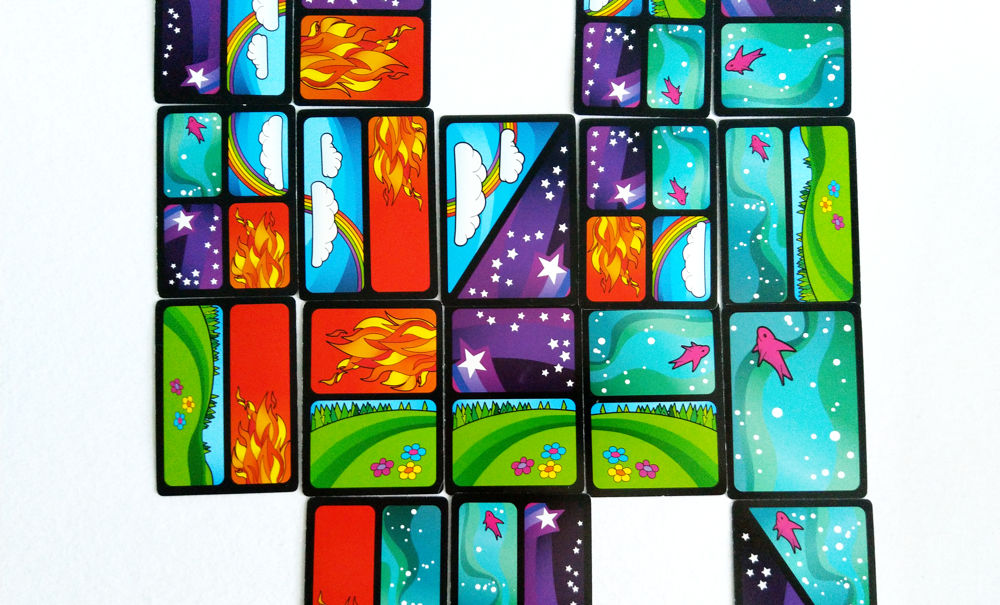 La verdad es que el juego es simple a más no poder. La cosa es tan sencilla como robar carta y colocar carta. Las dos únicas condiciones son que esa nueva carta se sitúe de modo que, al menos, uno de sus elementos coincida con el mismo de la adyacente; y, por otra parte, que respete la orientación de las que hay sobre la mesa. Existe la posibilidad de ganar cartas si se colocan de una manera especial pero poco más.