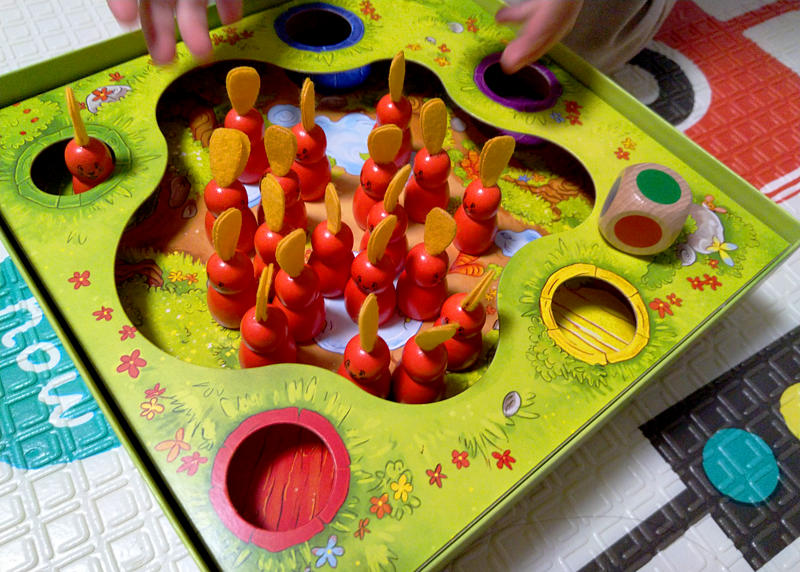 En torno al agujero central hay otros cinco más pequeños marcados con un color. Si el dado indica uno en el que hay ya un conejito esperando, el jugador se lo lleva a su lado; si esta pequeña madriguera está vacía, moverá uno del centro a esta especie de rampa de salida. Y así, se van agotando turnos hasta que se acaben los conejos, ganando el que más haya rescatado.