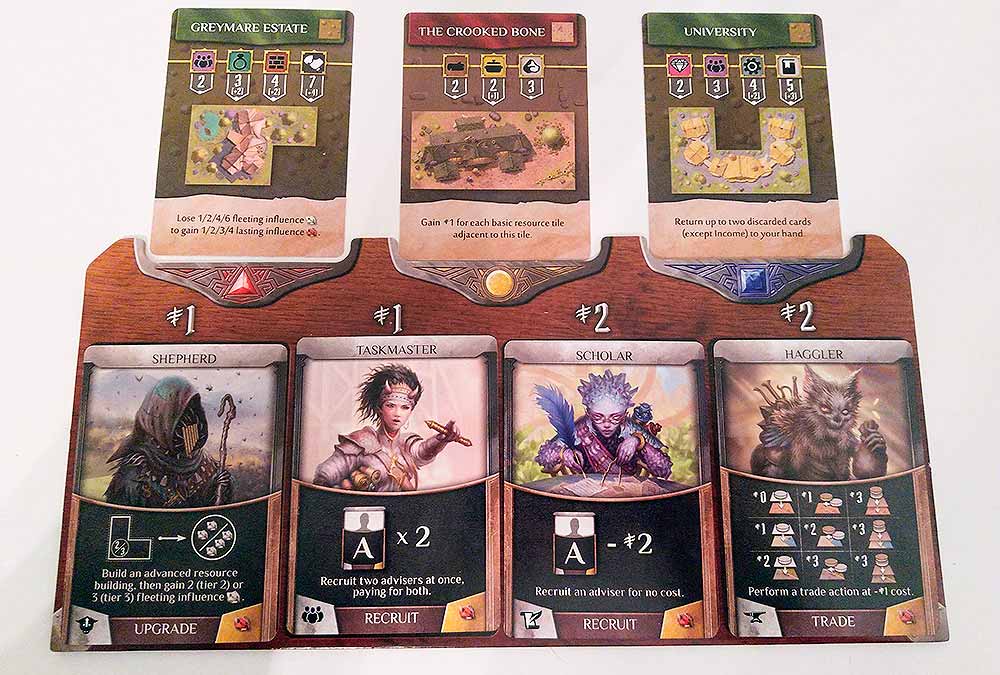 La adaptación a un lovely lonely implica varias modificaciones en su preparación. Por ejemplo, aquí el jugador controla los ocho recursos básicos, paradójicamente más sencillo de gestionar que cuando tienes dos o tres en partidas con gente. Obviamente, en solitario no ha lugar al seguimiento, ya que no hay rivales. Además, en la oferta de edificios de prestigio se colocan unas gemas de influencia según su posición en la mesa. Esto ‘simula’ la subasta que sin gente no tendría sentido, ya que nos obliga a hacer gasto adicional si nos interesara un edificio que se coloque a la derecha de la oferta (sólo el primero es gratuito). A veces lo gratis no es lo mejor: puede compensar hacer el esfuerzo si pensamos que nos va a ser más sencillo surtirle o colocarlo sobre el mapa.