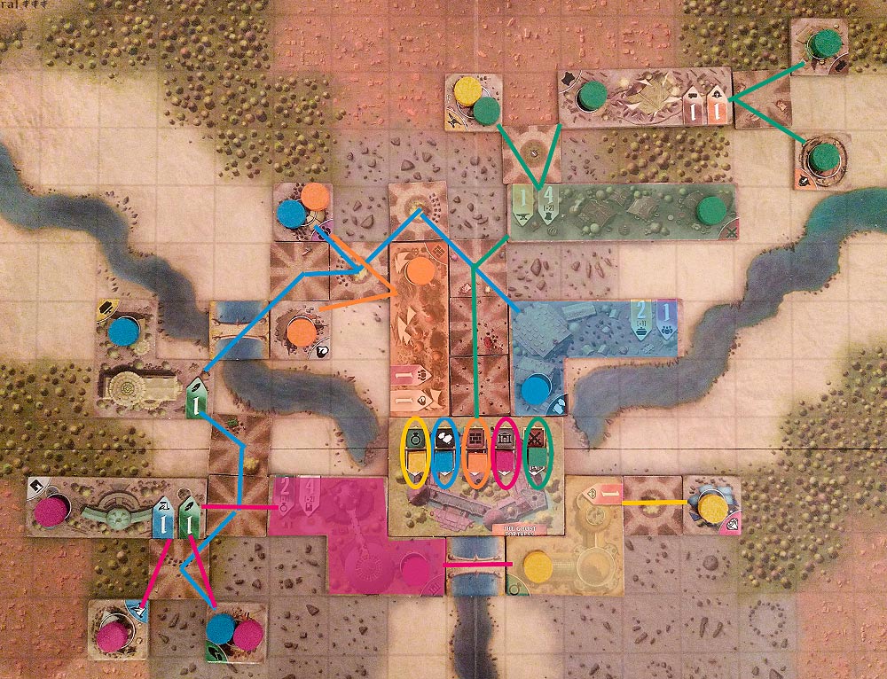 Este es un ejemplo bastante usual de lo que ocurre en esta ciudad. A veces es más fácil, pero pueden ocurrir situaciones en las que la cosa se complique. Es una cuestión de vista y de agilidad mental de la que, por norma general, no nos quedará mucha avanzada la partida. Llega un momento en el que hay tantas losetas y marcadores sobre el mapa que el reparto no resulta tan obvio; o nada obvio, de hecho: casi en todas las partidas que he jugado se han pasado por alto por puro cansancio conexiones que nadie tenía en cuenta y que procedían de un parte alejada del tablero. Además, la cosa se complica si, como sucede, se dan reacciones en cadena que implican a varios jugadores.