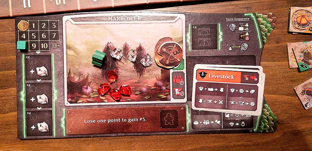 Una cosa peculiar de Founders of Gloomhaven es que, siendo el rango de 1 a 4 jugadores, para cada número la forma de jugar es algo diferente. Con dos y tres, por ejemplo, entran en juego los recursos neutrales. Son los básicos que quedan libres al no pertenecer de inicio a ningún participante y que hay que importar ex profeso a un coste más elevado de lo normal. Esto introduce nuevas decisiones ya que, ¿por qué voy yo a costear algo que todos pueden aprovechar a menor precio posteriormente?