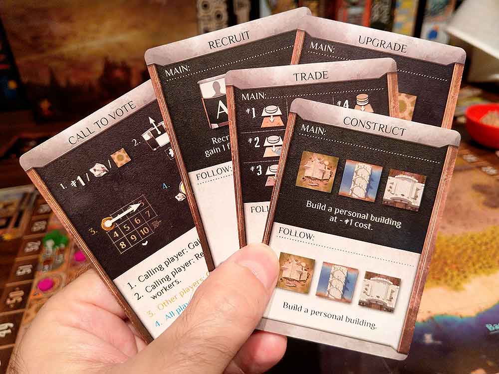 Comprender las mecánicas del juego es muy sencillo. Las reglas y la dinámica son fáciles de entender. Tanto, como tener en cuenta que tenemos una mano de cartas con cinco acciones posibles y en cada turno debemos poner una sobre la mesa. A medida que avance la partida engordaremos este mazo personal con otras que mejoran las opciones iniciales. Pero tanto con unas como con otras, el qué hacer no es un problema: trajinar con los recursos propios o ajenos, generar edificios de manufacturas, ubicar construcciones personales, contratar ayudantes o, como acciones básicas, ganar monedas o puntos de influencia o acceder a acciones avanzadas.