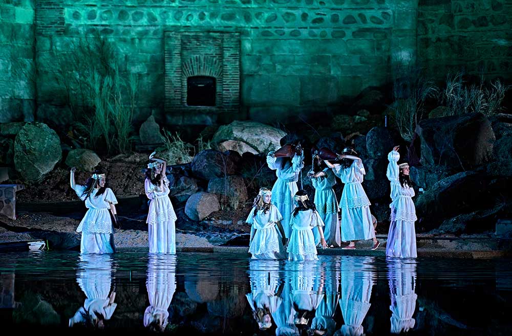 ‘A pluma y espada’ presenta un auditorio igualmente impresionante ante un teatro de apariencia más convencional. Sin embargo, en el momento en el que empiezan a sonar los primeros acordes de la música, asistimos nuevamente a un prodigio de caracterización en la que la corrala que recibe al público va tornándose en cárcel o en barco. El protagonista aquí es Lope de Vega, tan genial en lo literario como amante de las trifulcas y la buena vida. Una biografía apasionante llena de aventuras que ahora toma vida en este espectáculo.
