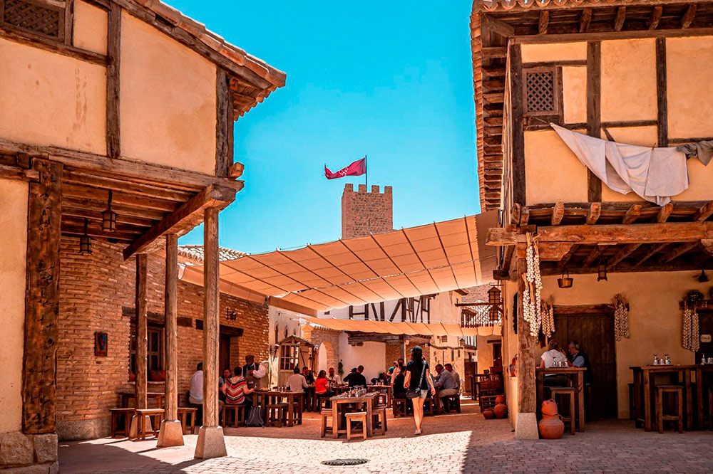 Lo primero que salta a la vista son las distancias. Se trata de un lugar muy extenso, que aprovecha la intrincada orografía próxima a la ciudad de Toledo para establecer una serie de caminos de tierra (la inmersión es completa en este punto) que van conectando las distintas zonas. Pero incluso ya desde la taquilla lo que más va a llamar la atención es el pedazo de castillo que recibe a los visitantes desde la lejanía, creado ex profeso para el parque y que, para cualquiera que anduviera despistado por la zona, pasaría por otra joya arquitectónica más de las que abundan por allí.