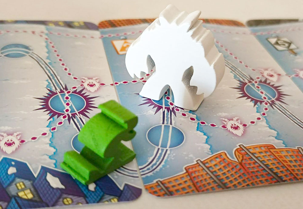 El Yeti se mueve al son del más rápido. El jugador que vaya más retrasado en la carrera decide hacia dónde se mueve el animalico. Y como su recorrido se cruza con el que siguen los deportistas, allí donde el monstruo atropelle a un esquiador le deja una pequeña penalización para el turno siguiente. Es decir, su papel es el de incordiar, el de dar pie a la interacción más puñetera y que, por otra parte, incide en el énfasis de compensación que existe en casi cada aspecto del juego.