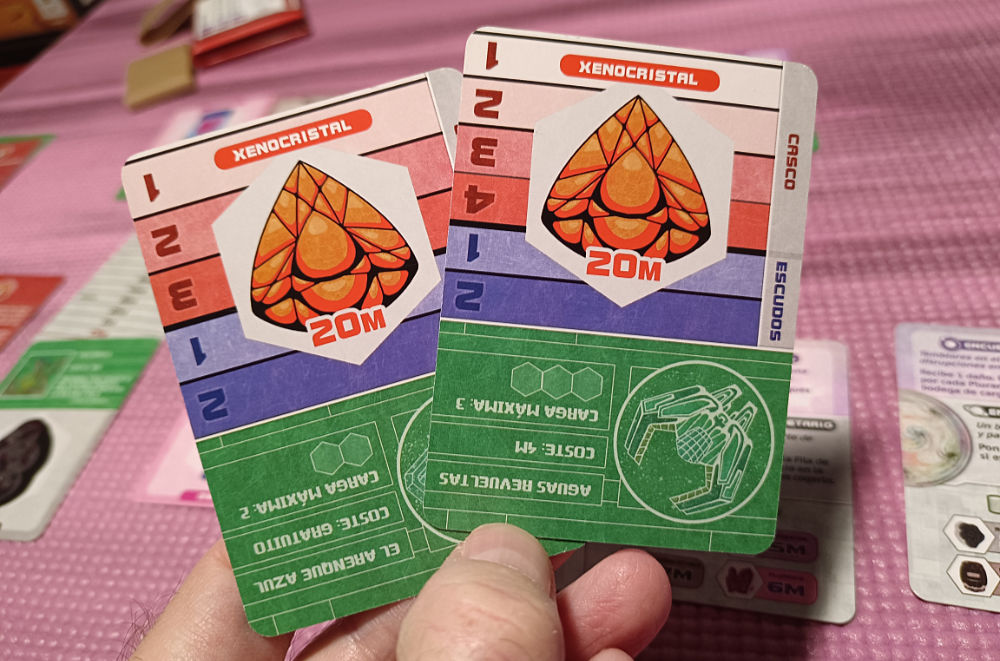 Hay otra cosa, otro elemento, que subyace sobre toda la mecánica y es el manejo del tempo. La necesidad de establecer cierto control sobre los xenocristales para evitar los daños o incluso eludir que el rival saque sus zarpas resulta clave. Al comienzo podremos hacer poco pero la cosa es aprender a manejar el mercado, los efectos planetarios o incluso hacernos con mejoras para la nave que nos den algo de cuartelillo. Repito: no es un juego de grandes decisiones ni que tenga un control absoluto pero, dentro de la modestia del conjunto, de las pretensiones de estos juegos mínimos, a poco que uno se meta en el papel se encuentra con una sorpresa galáctica.