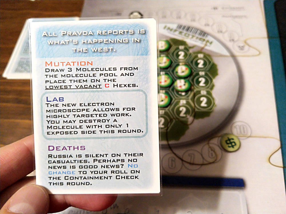 Lo de la coordenada es relevante al comienzo de cada ronda. Tal como está estructurado el juego, cada turno empieza desvelando una carta ‘de informe’ que tiene tres secciones. La primera es la relativa al comportamiento del virus y generalmente introducirá mutaciones que implican colocar nuevas moléculas o sustituir las que hubiera, y en todos los casos te indica el dónde señalando un lugar concreto.