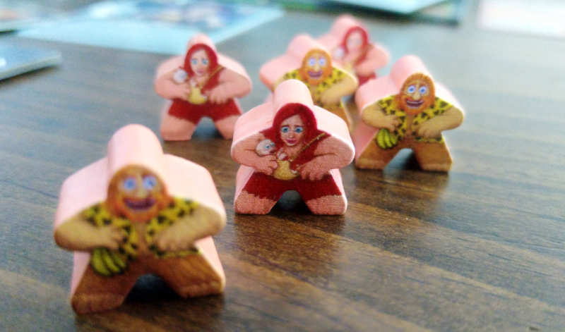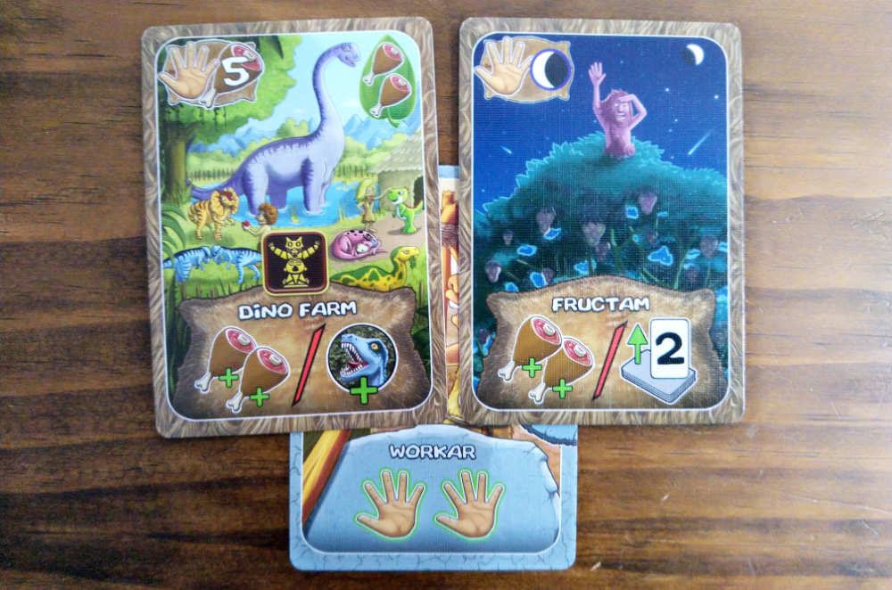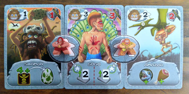 A grandes rasgos, hay dos tipos de cartas. Las de clan, en la que se muestra a un personaje -peculiar el arte y los nombres, ciertamente-; y las de acción, con efectos más poderosos. Las primeras, en las que los ilustradores han echado el resto, presentan diferentes personajes susceptibles de vivir en la aldea, cada cual con un potencial diferente. Son la base del juego porque, según cómo las usemos, encontraremos uno u otro efecto. Cada una tiene un coste de adquisición desde el ‘mercado’, si procede. Además, tienen un nivel de fuerza que se usa para cazar o para atacar a un dinosaurio y un posible efecto directo que nos da si la usamos para ello. Es en esas cosas, principalmente, donde se notan las mayores diferencias entre las cartas iniciales y las que vengan a posteriori.