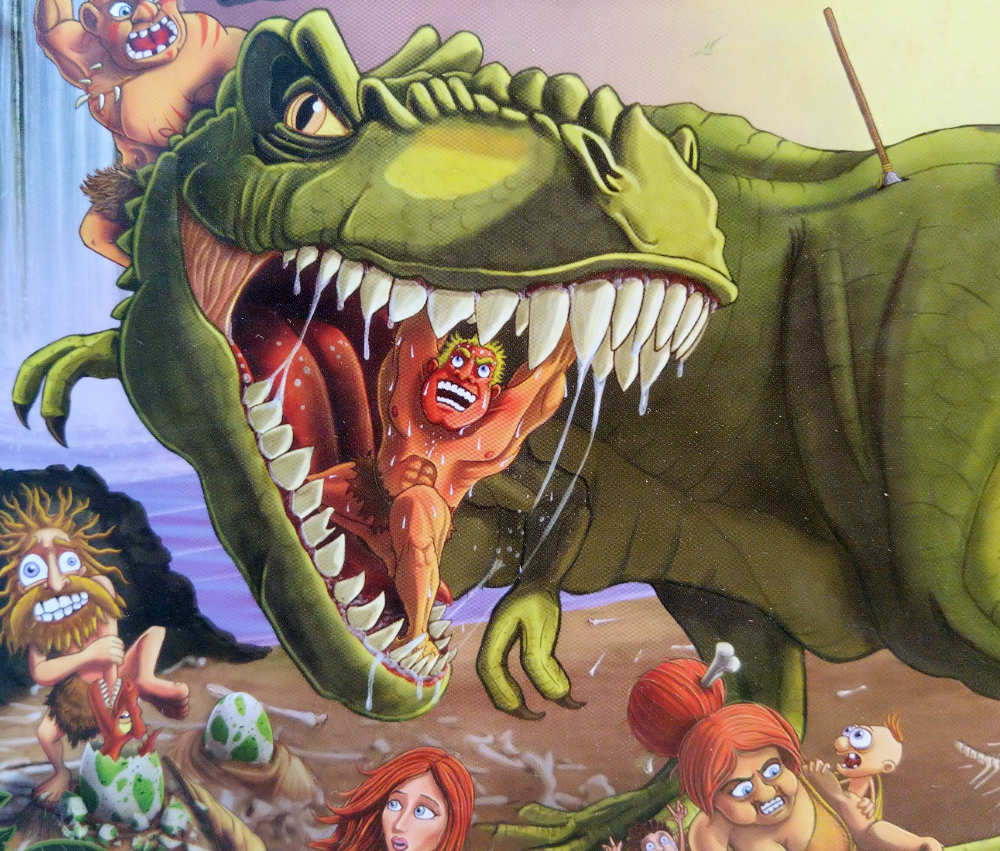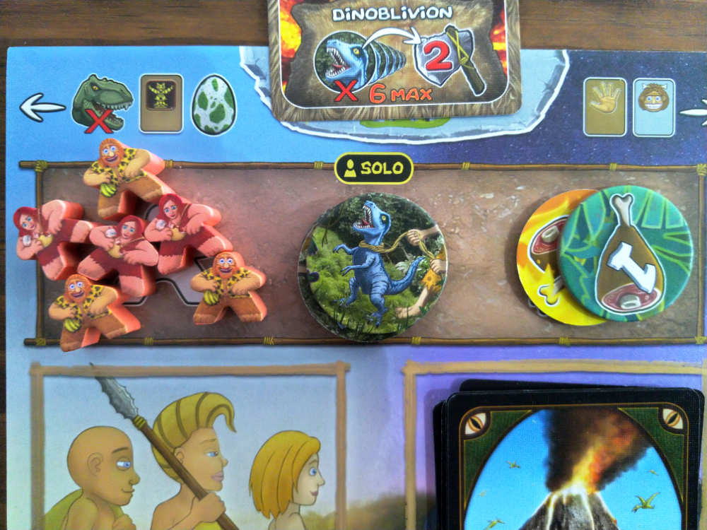 Bien, dejemos de respirar chemtrails y ciñámonos a la realidad más próxima. Esto es, comentar algunas nociones sobre Dinoblivion, un juego firmado por el francés Jean-François Gauthier allá por 2020. Se trata de un deckbuilding o de construcción de mazo que retoma la línea iniciada por el autor con Goblivion (2018) y, posteriormente, con GOLDblivion (2023). El éxito de esta línea de productos se sustenta en un mecanismo realmente sencillo y con un ritmo y una agilidad extraordinaria. En el que nos ocupa hoy, no es que invente la rueda ni el fuego (que a la luz de las ilustraciones ya estaban inventados), pero sí que ofrece una dinámica bastante bien engrasada y cuyo principal objetivo es mantener a salvo la aldea en la que vive esta gente del merodeo de unos dinos tan malencarados como peligrosos. Y por si fuera poco, con la amenaza de un poderoso volcán en el horizonte. Nadie dijo que la vida del prehistórico fuera fácil.