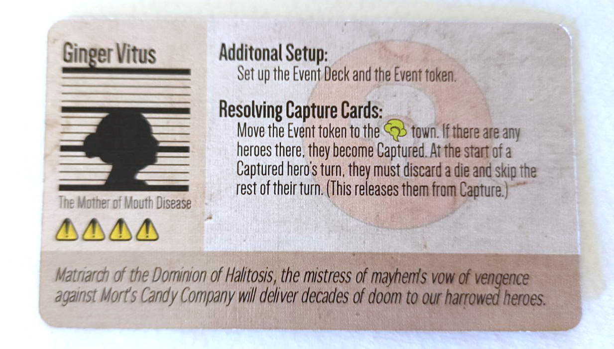 Lo de la tirada de dados es un momento clave también porque además de prefijar las opciones de acción, según lo que salga también puede generar problemas. No se han comido mucho la cabeza los autores para llamar así a lo malo que sucede en la ciudad. El caso es que cada uno de los villanos contra los que podemos luchar en Mint Cooperative te puede hacer sacar una, dos o más cartas de este tipo que, principalmente, te retiran pastillas de las localizaciones que marquen. Solo si los cuatro dados acaban con guarismos de tres o menos sales indemne del lance.