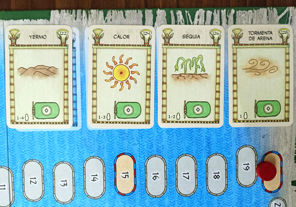 Otra de las grandes cuestiones en un juego de estas características es el cómo se consiguen nuevas cartas. Poca sorpresa en este apartado, realmente: hay que acudir a un mercado. Pero también en este epígrafe el diseñador alemán le ha introducido un girito muy interesante y estratégico. Y es que, aparte de funcionar como el lineal de un supermercado, su permanente renovación ejerce de temporizador de la partida. Eso sucede cuando quedan a la vista de forma simultánea cuatro cartas de desastres naturales.