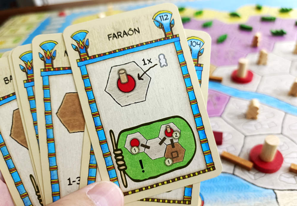 ¿Cómo hacer la pelota al faraón, que es a lo que hemos venido? Bueno, tomemos como punto de partida el mapa, que representa la península de Fayún. El juego nos coloca en la piel de un constructor pionero que debe contribuir a la urbanización de esta geografía, tan fértil como desafiante e infestada de cocodrilos. Para gloria del mandamás hay que ir transformando estos parajes en poblados, ciudades, templos, ‘carreteras’, etc. Hacerlo rentable. Especulación faraónica. Eso es lo que nos va a permitir hacer las cartas. Vuelta a las cartas.