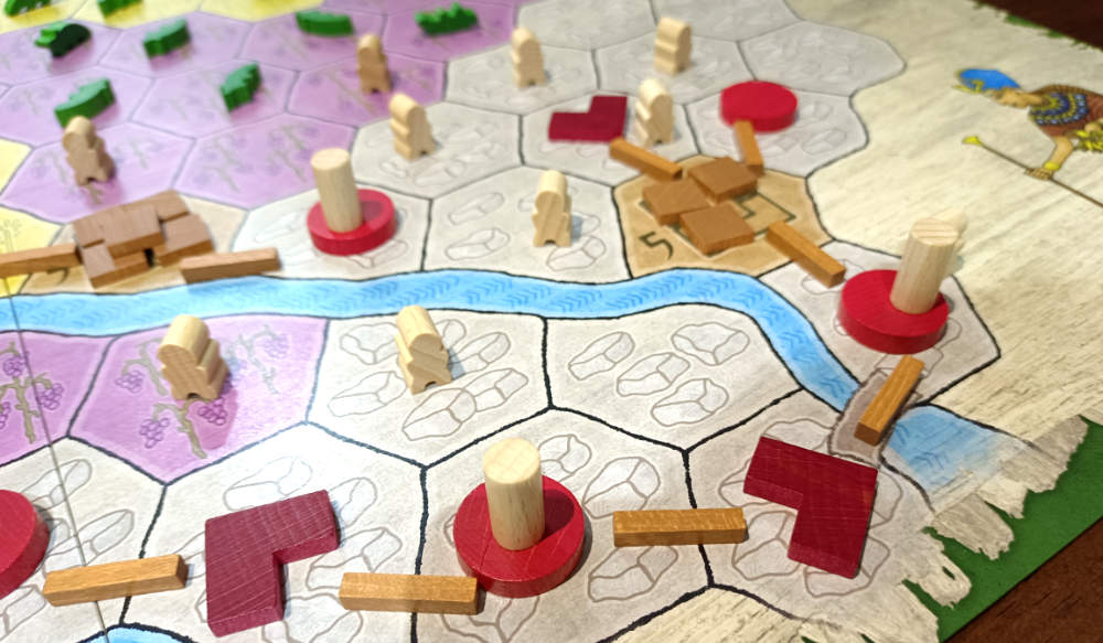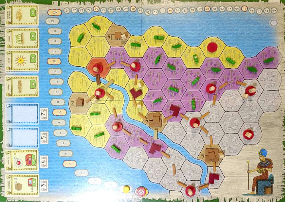 ¿Qué más decir? El arte, por ejemplo. Llama la atención por espartano. En esto también parece de otro tiempo: es una caja con un precio más o menos asequible, con muy buenos componentes -madera por doquier-, con cartas muy bien diseñadas y un tablero inmenso y claro; pero reconozcámoslo, no especialmente bonito. Además, los cocodrilos del comienzo son un punto. No creo que les importe empezar acostados -imaginen el coñazo de ponerlos bien cada vez-, pero son graciosos. Menos cuando el faraón decide que seamos su merienda. Mejor contentarle.